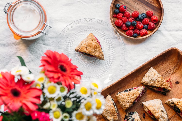 We always roll out the scones during special occasions. I think it’s a part of our British heritage to enjoy a good scone every now and then with a pot of tea (well, coffee in my household) with the family. Whilst I’m used to sometimes sickeningly sweet scones topped with thick cream and jam, these are a wonderful change. They’re baked with the berries inside of them to give them a beautiful fruity flavour. I’d still add some coconut whipped cream.